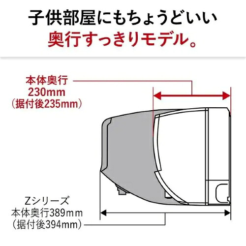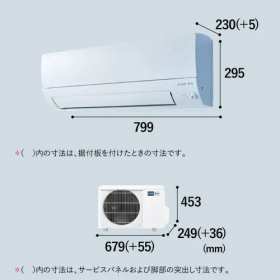 ・サイズ(約):室内機:幅799×高さ295×奥行230(+据付板5)mm、室外機:幅679(+配管カバー部55)×高さ453×奥行249(+脚部36)mm