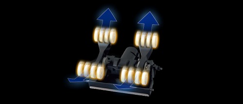 お尻から太もも裏の大きな筋肉に沿うように16個のローラーで幅広く伸ばし上下の動作を加え波打つような立体的なもみ動作でしっかりもみほぐします。