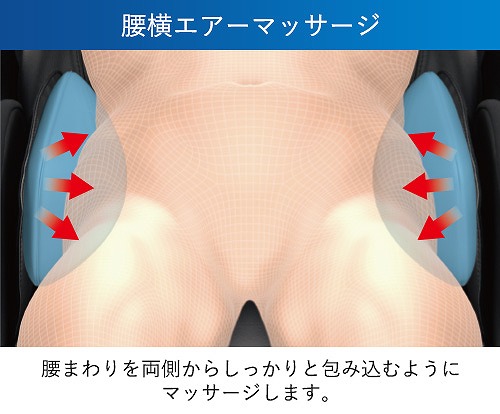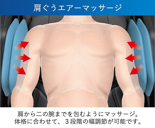 肩・腕・腰まわりを大型エアーバッグで包み込み圧迫と開放を繰り返し心地よくほぐします。