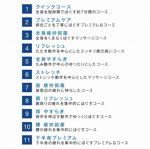 15分間の全身コース5種と部位コース5種、7分間のクイックコース、合わせて11種類の自動コースの中からお好みで選択することができます。