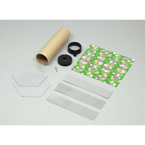 セット内容:紙管(φ39×140mm)×1、ミラー(31×140mm)×3、キャップ(上・下)×各1、千代紙(140×125mm)×1、ネジ×1、透明板・六角(100×100×2mm)×2