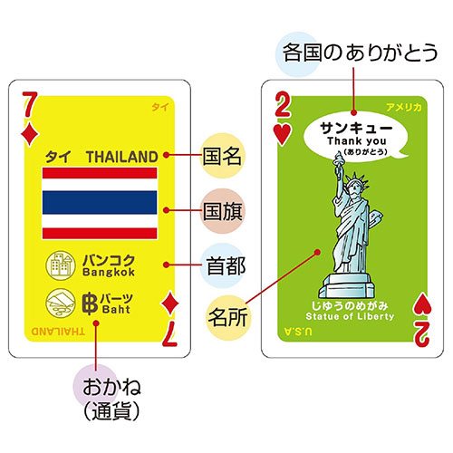 世界の国々がトランプに!国名や国旗、首都や通貨などの基本的な情報に加え、あいさつや名所、民族衣装などの文化も学べます。載っている国は13カ国!世界の13か国がトランプに! 目で見て遊んで楽しんで学べる!